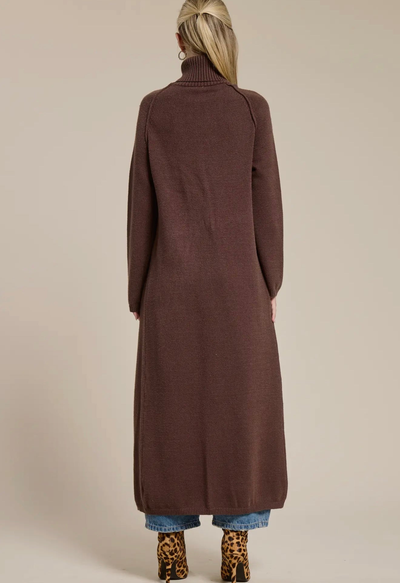 This cozy midi sweater dress is made from heavyweight knit and featured a ribbed turtleneck, long sleeves, and exposed seam detailing down the shoulders and front. Style with your favorite denim or skirt
