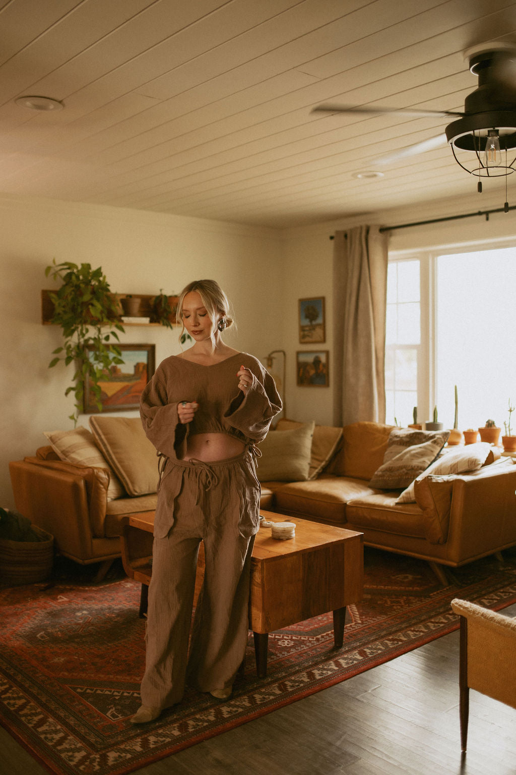 Made for comfort without sacrificing style. The Desert Dusk Gauze Pants feature a flowy, wide-leg silhouette with a soft elastic waistband and adjustable drawstring for the perfect fit. Finished with subtle side tie details and a breathable drape, these pants are an elevated lounge essential—perfect worn alone or styled with the matching top.