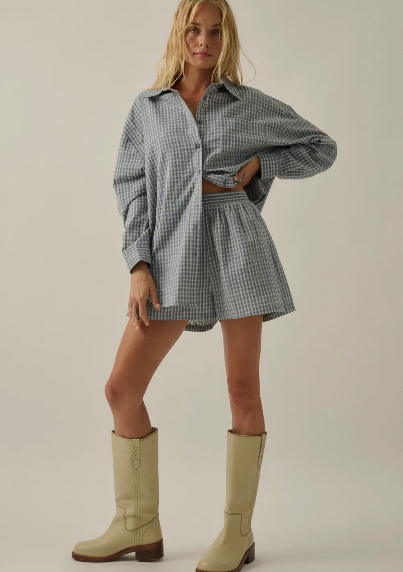 Meet your new go-to set for effortless days. This relaxed blue check button-down and matching pull-on shorts are made from a lightweight, breathable fabric that feels as good as it looks. Designed to be worn together or styled separately, this set delivers that perfectly undone, borrowed-from-him vibe with a flattering, easy fit. Whether you’re lounging at home, running errands, or packing for a weekend away—this one does it all.