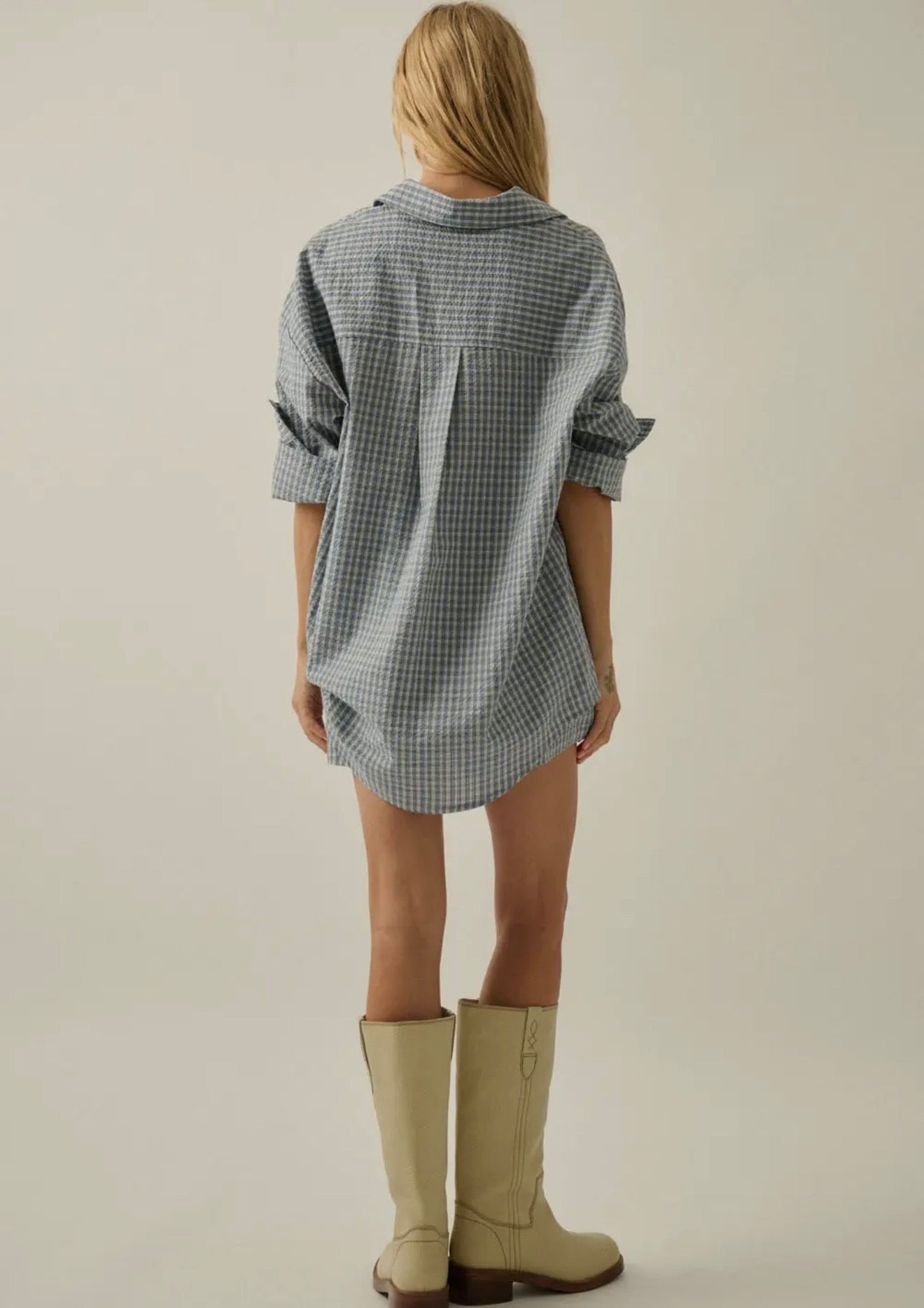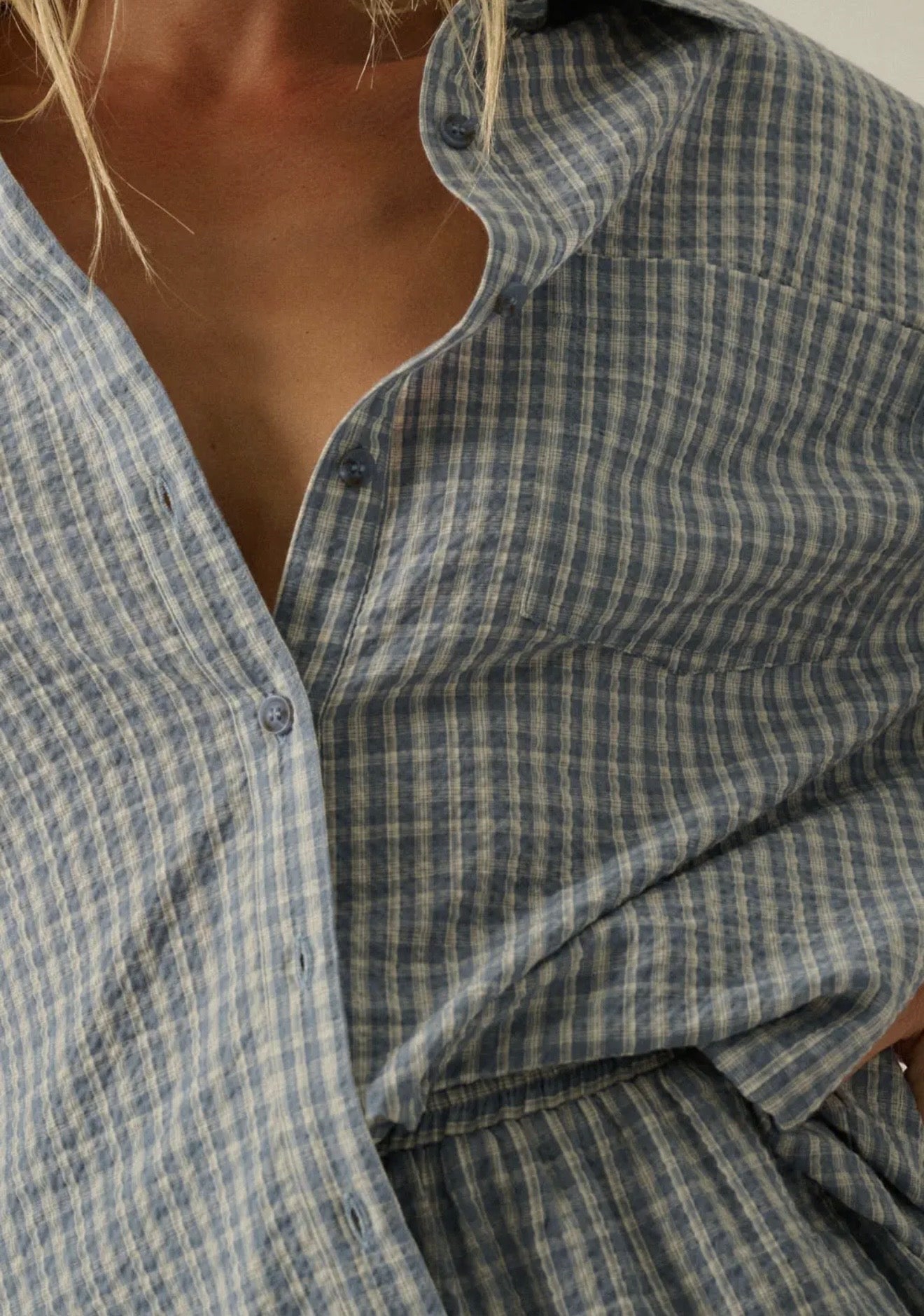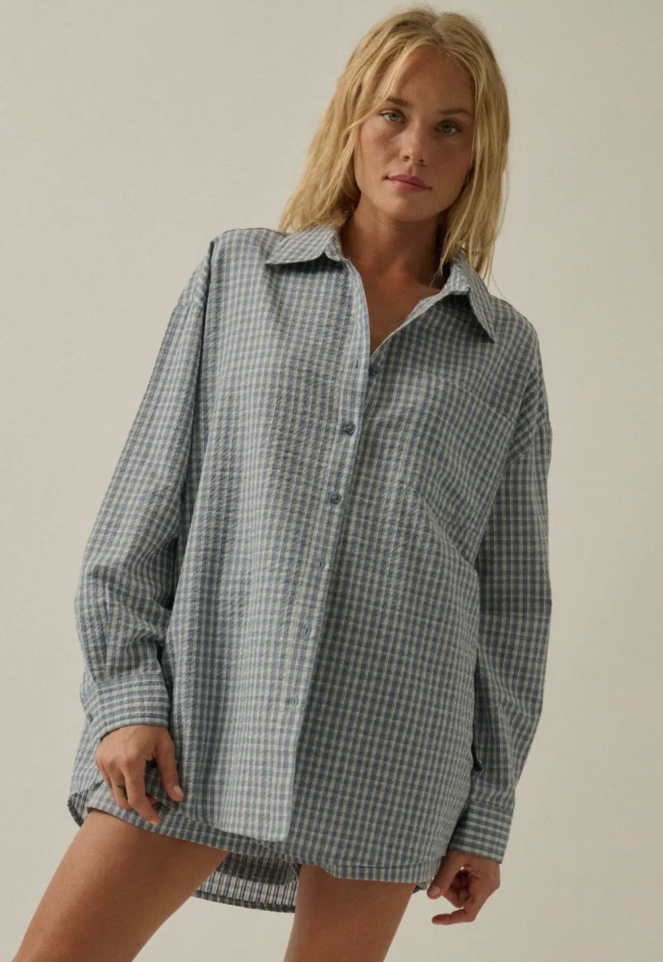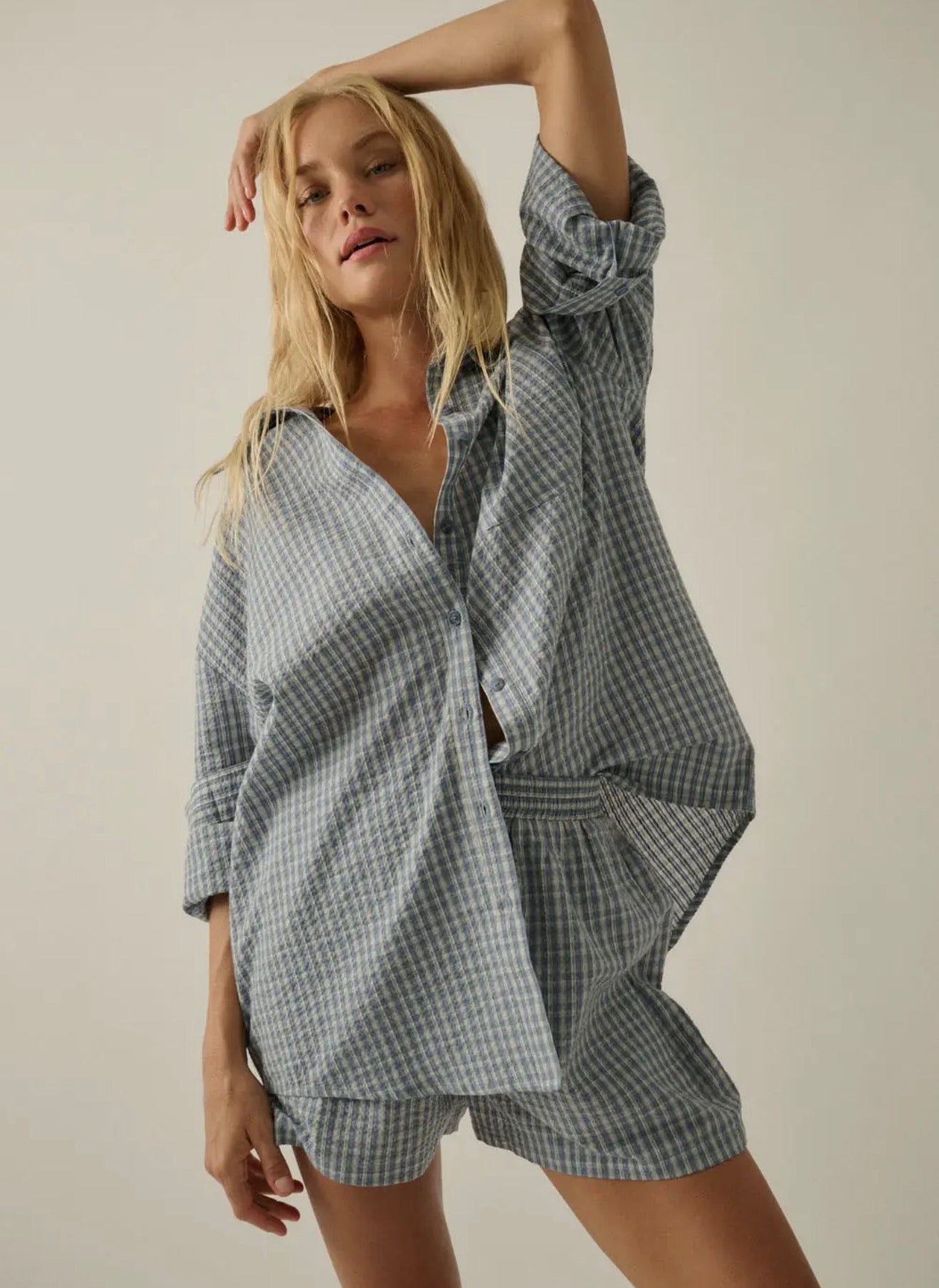 Meet your new go-to set for effortless days. This relaxed blue check button-down and matching pull-on shorts are made from a lightweight, breathable fabric that feels as good as it looks. Designed to be worn together or styled separately, this set delivers that perfectly undone, borrowed-from-him vibe with a flattering, easy fit. Whether you’re lounging at home, running errands, or packing for a weekend away—this one does it all.