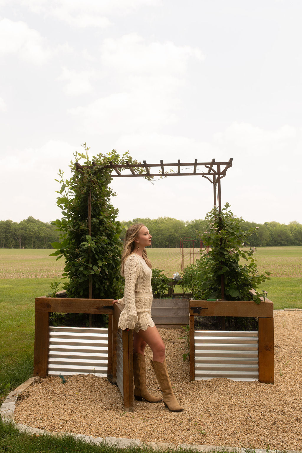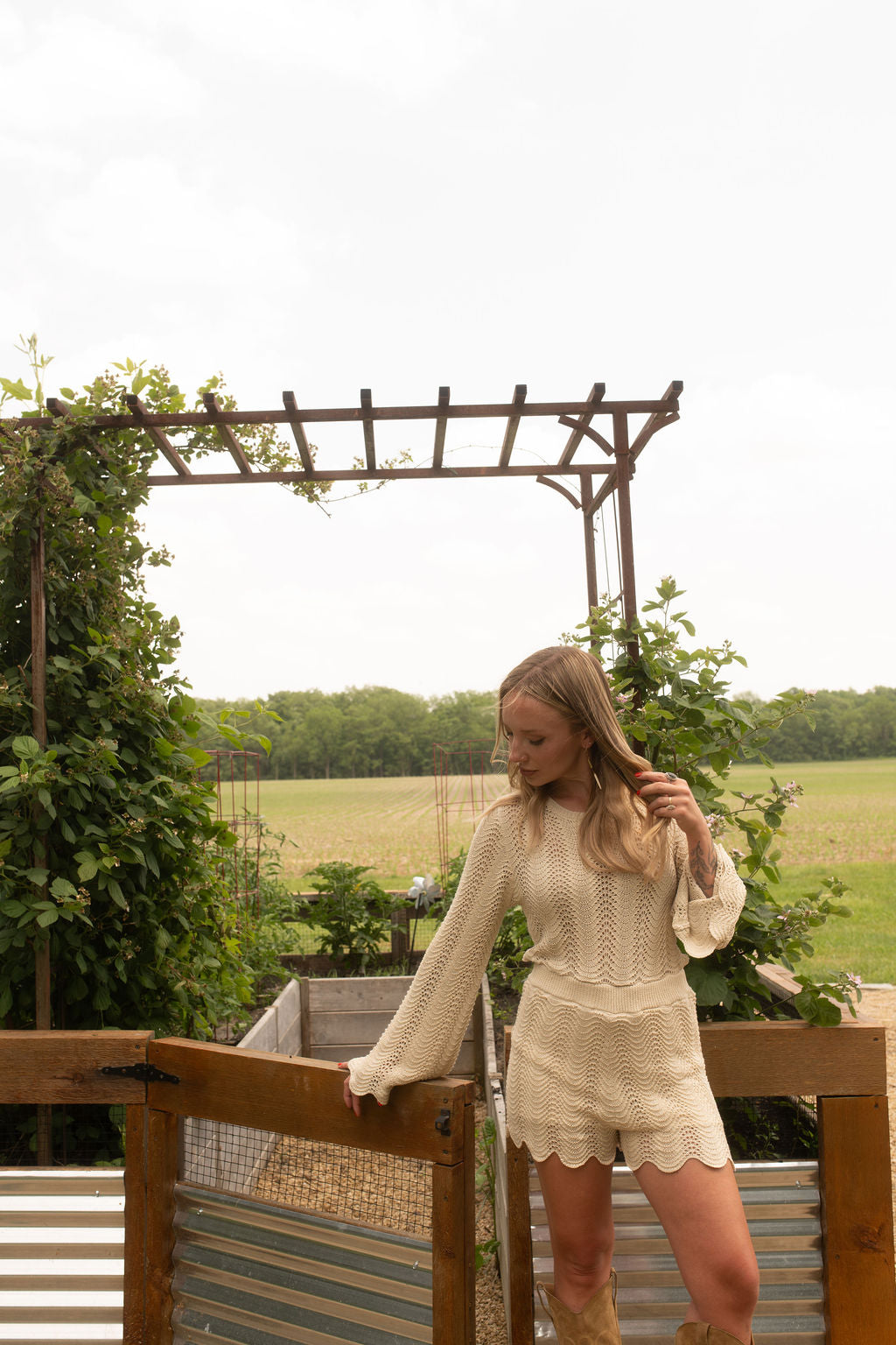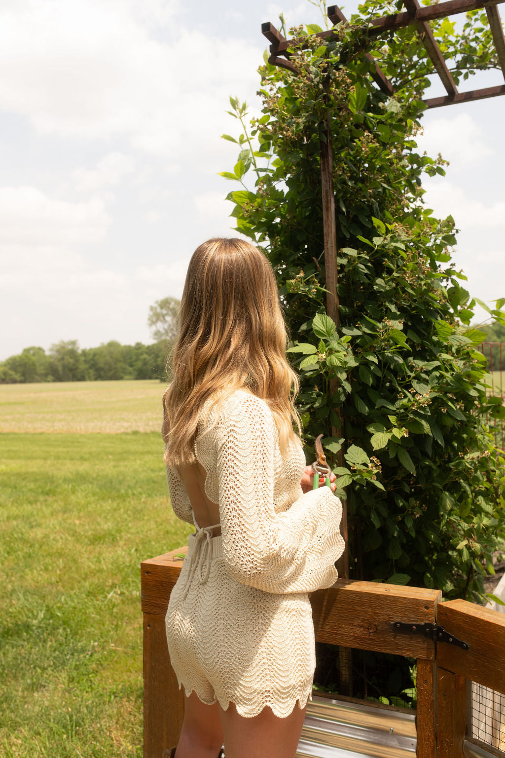 Miranda Romper. With its intricate crochet long sleeves and open back design, this romper exudes bohemian charm. Lined only in the shorts, it is perfect for warmer weather. Don't miss out on this unique and stylish addition to your wardrobe.