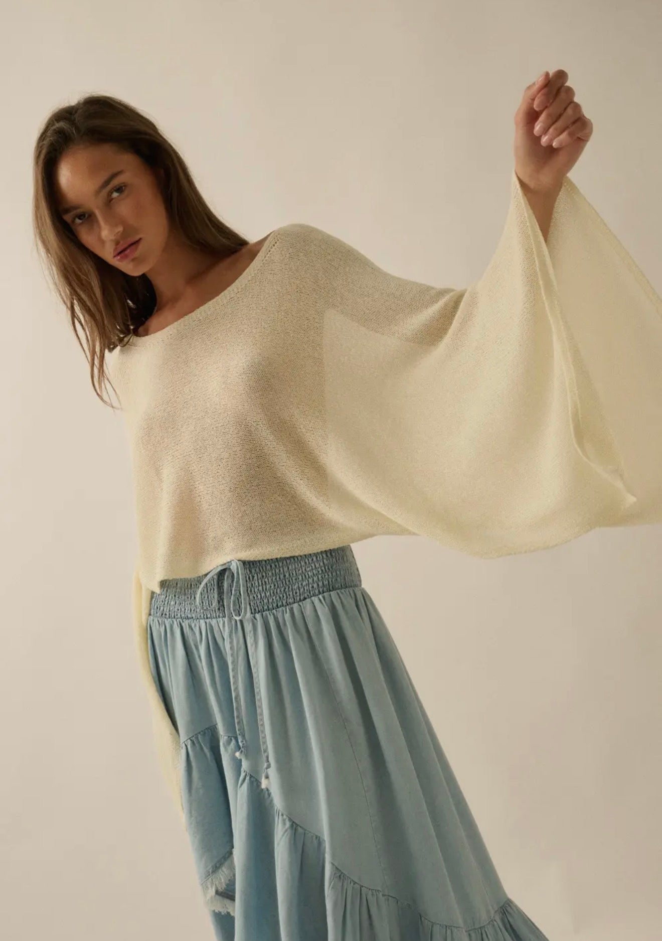 Light as air and endlessly versatile, the Drift Poncho Top features a soft, sheer knit with wide flowing sleeves and a flattering, relaxed shape. Easy to dress up or down, this piece layers beautifully over basics and brings subtle texture and movement to your everyday wardrobe.
