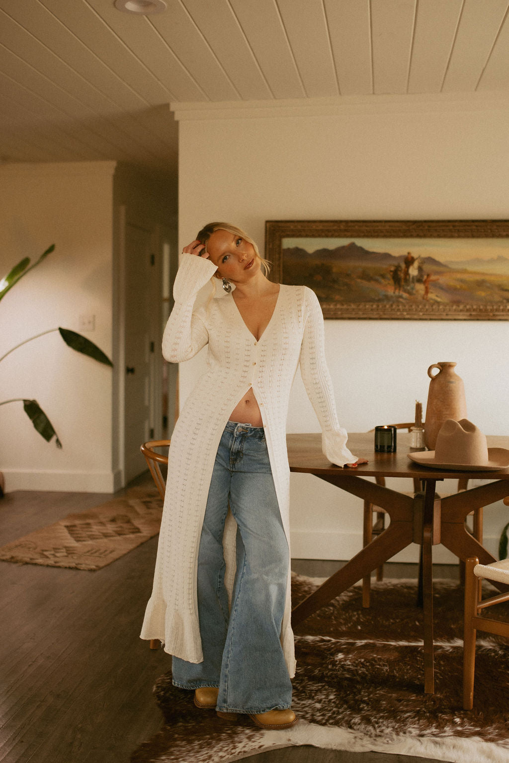 An effortlessly draped knit duster designed for everyday layering. Featuring a lightweight open-knit texture, button-front detail, and subtle flare hem for movement, the Solstice Duster adds instant polish to denim, dresses, and everything in between. Easy, airy, and endlessly wearable — a year-round staple with a laid-back bohemian feel.