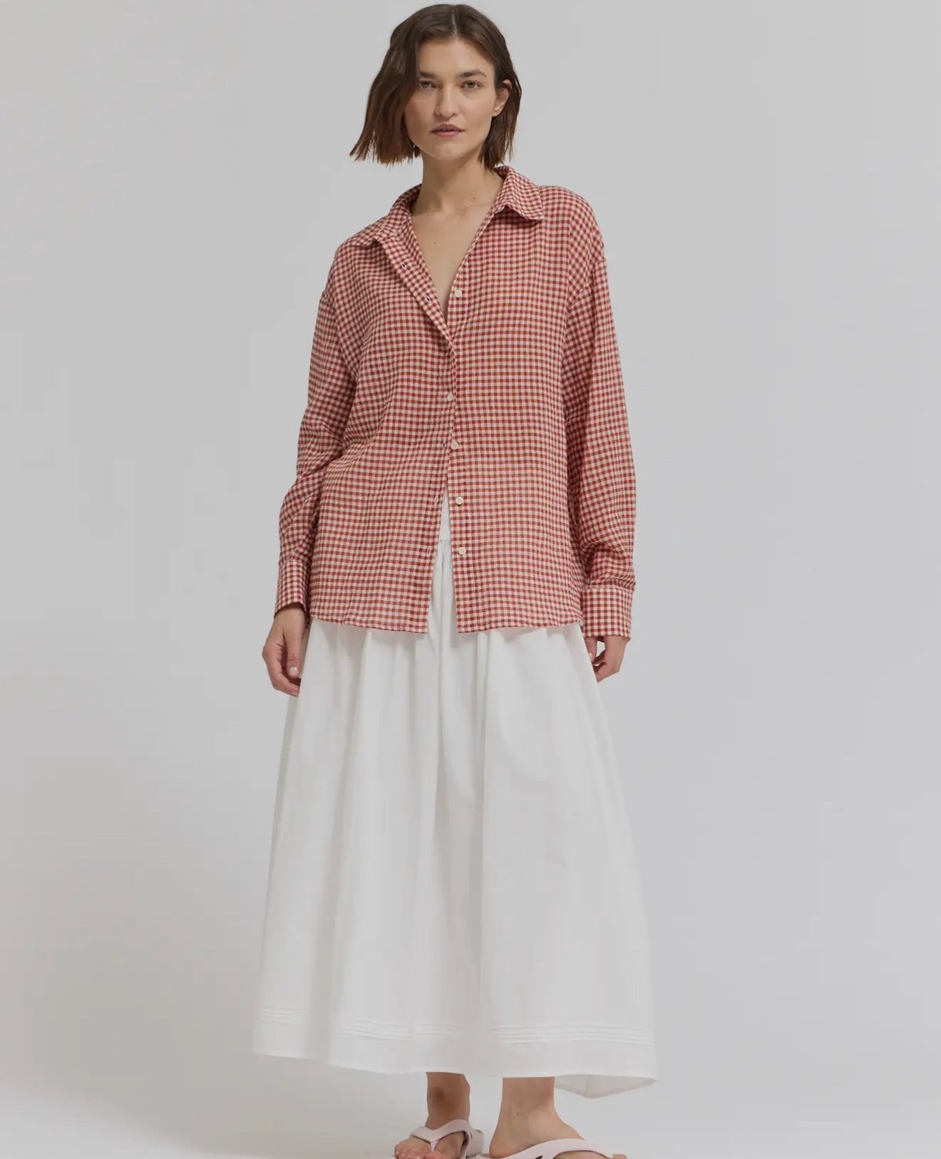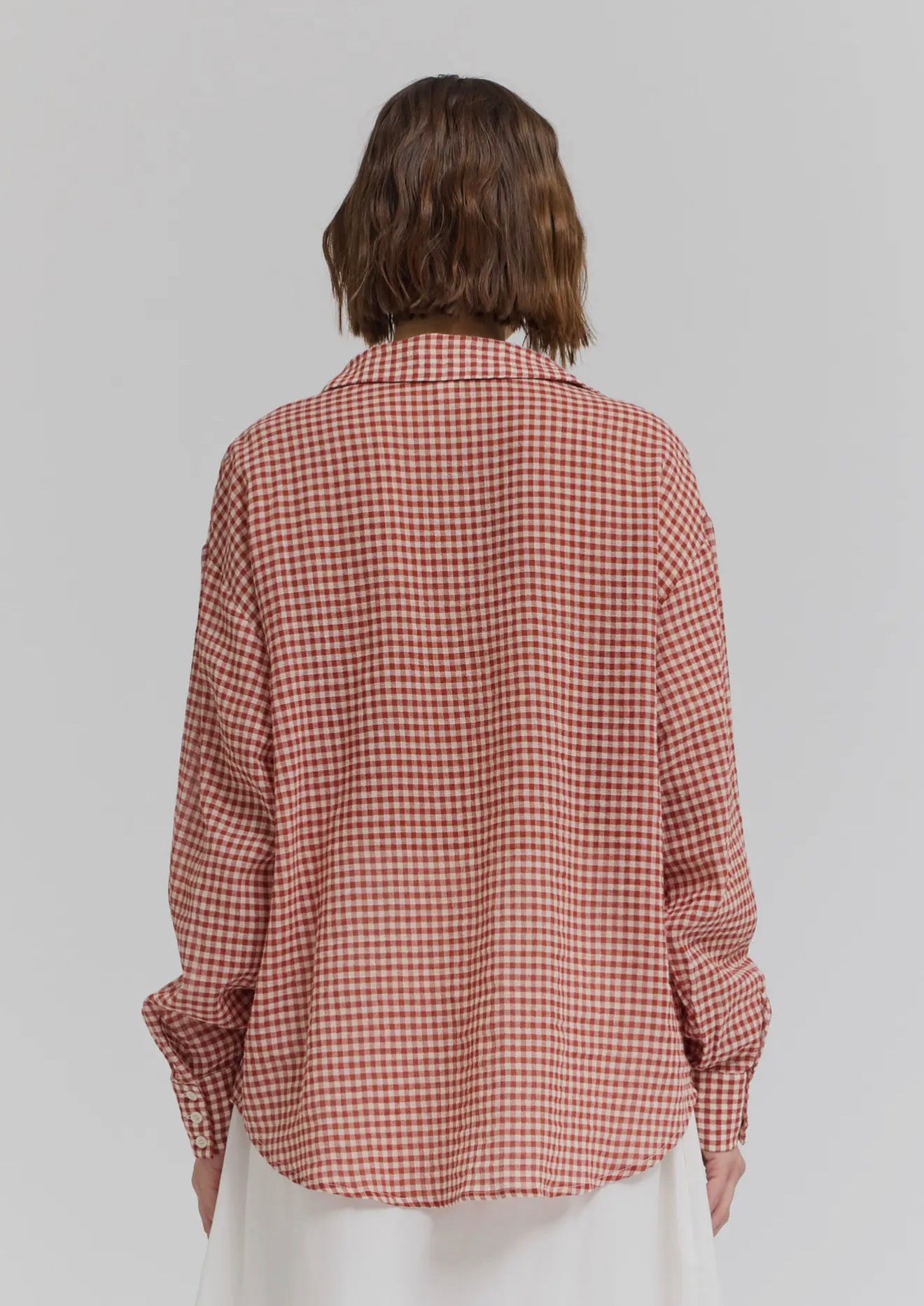 Effortless and softly tailored, the Rust Meadow Gingham Button Down brings that easy, lived-in charm your closet craves. Designed in a warm rust-and-cream micro gingham, this relaxed-fit shirt features a classic collar, functional front buttons, and an easy drape that makes styling feel second nature. Lightweight and breathable, it’s perfect worn loose over denim, layered under knits, or half-tucked for that undone, boho feel.